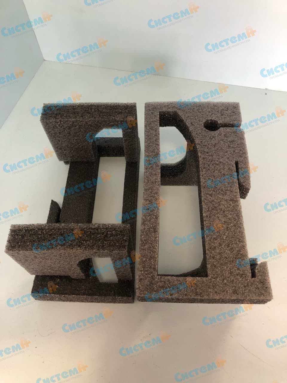 Перед производством партии было запланировано изготовление образца для тестирований защитных функций в среде эксплуатации. Несшитый пенополиэтилен обработали на плоттере – производство образца, включая доработку чертежа, заняло три дня. Размеры единиц комплекта – 580х192х217 мм и 580х192х215 мм. А основной технологией производства крупной серийной партии выбрана высокопроизводительная технология, с применением которой можно добиться низкой стоимости единицы, – вырубка.